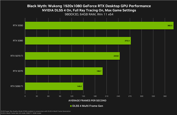 而在1080P分辨率下,平均5.2倍的性能倍增讓所有GeForce RTX 50系顯卡實(shí)現(xiàn)190 FPS的極致畫質(zhì)體驗(yàn),RTX 5080與RTX 5070 Ti達(dá)到240 FPS,RTX 5090更可飆升至380FPS。