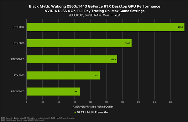 在2K分辨率下,平均5.8倍的性能提升使所有GeForce RTX 50系臺式顯卡都能以最高畫質(zhì)流暢運(yùn)行,其中RTX 5090幀率最高可達(dá)295FPS。