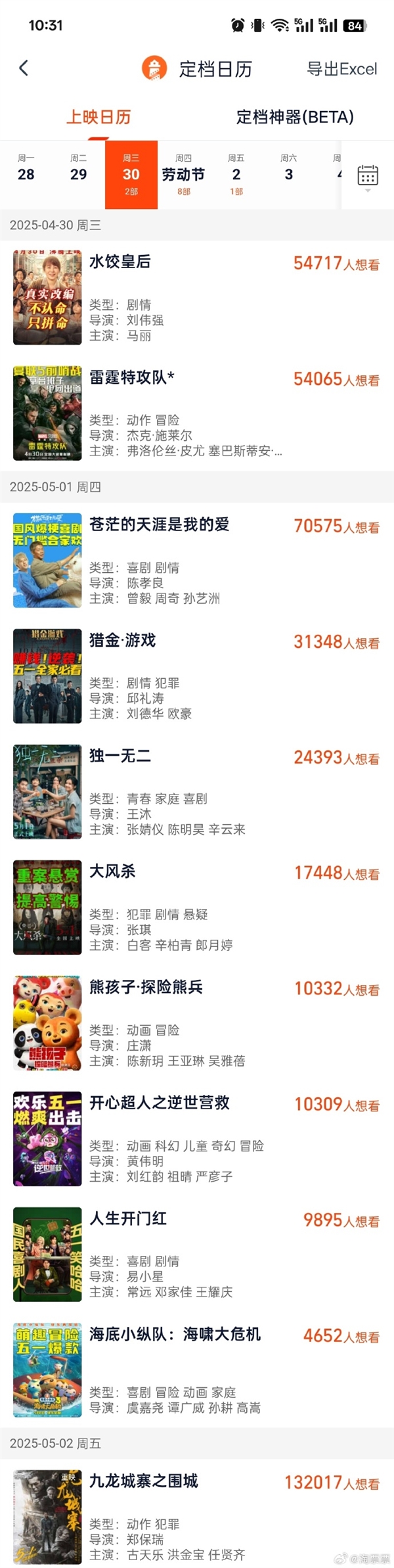 據燈塔專業版上映日歷顯示,截至當前已有11部電影定檔2025五一檔上映。