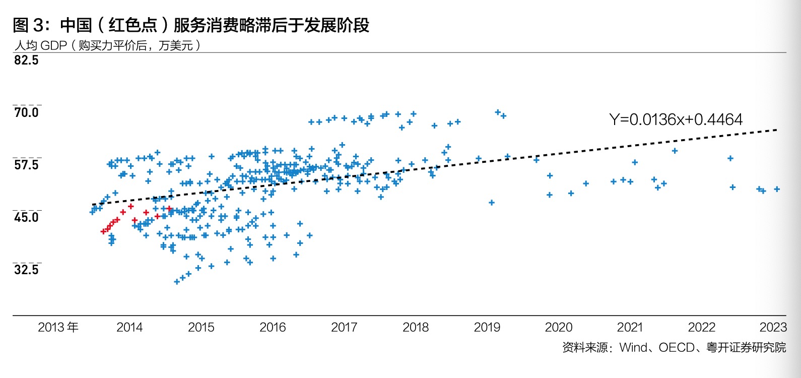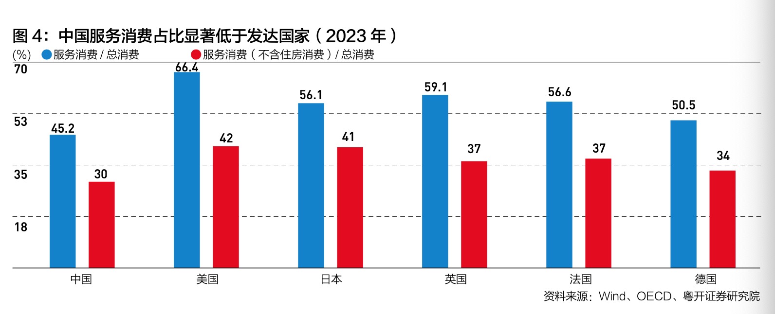 第二,我國當(dāng)前的服務(wù)消費(fèi)水平相對于發(fā)展階段略顯滯后,與發(fā)達(dá)國家差距明顯。基于OECD數(shù)據(jù)庫中約40個經(jīng)濟(jì)體的歷史數(shù)據(jù),服務(wù)消費(fèi)占比與經(jīng)濟(jì)發(fā)展水平呈現(xiàn)明顯的正相關(guān)關(guān)系,我國當(dāng)前的服務(wù)消費(fèi)水平略滯后于發(fā)展階段。與主要發(fā)達(dá)國家比較,我國服務(wù)消費(fèi)水平的差距更加顯著:2023年,美國服務(wù)消費(fèi)占比為66%,日本、法國、英國均接近60%,德國為50%,較中國高出5~20個百分點(diǎn)不等。即使是剔除相對“痛感”較強(qiáng)的住房消費(fèi),我國住房以外的其他服務(wù)消費(fèi)占總消費(fèi)的比重依然顯著低于上述發(fā)達(dá)國家。