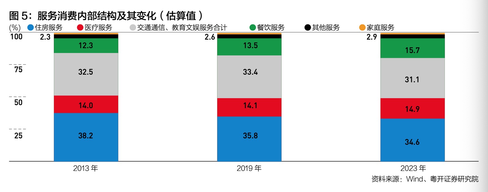 第三,居住是居民的基礎(chǔ)性需求,長期以來住房服務(wù)都是服務(wù)消費(fèi)中占比最高的單項(xiàng)服務(wù)。基于公開數(shù)據(jù)估算服務(wù)消費(fèi)的結(jié)構(gòu)后,可見2023年住房消費(fèi)占服務(wù)消費(fèi)比重為34.6%。值得注意的是,居民通過自有房為自身提供的居住服務(wù)是住房服務(wù)的主體。如果將自有住房折算租金的核算從成本法全面轉(zhuǎn)向市場法,我國居住消費(fèi)將會顯著提高,住房服務(wù)消費(fèi)占比會更高,住房以外的服務(wù)消費(fèi)占比會更低。