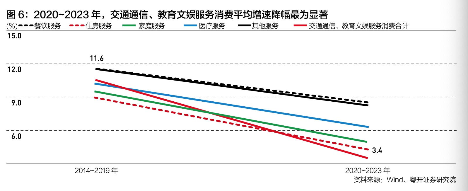 第四,改善性較強(qiáng)的交通通信、教育文娛消費(fèi)占比在2019年后下降,增速降幅最大。據(jù)估算,2023年交通通信、教育文娛服務(wù)合計占總消費(fèi)的比重為31.1%,較2019年下降了2.3個百分點(diǎn)。這反映出近年來,改善性較強(qiáng)的服務(wù)消費(fèi)增長較為有限。比較各類服務(wù)消費(fèi)的增速變化也可見:交通通信、教育文娛服務(wù)在2019年之后的增速降幅最大。