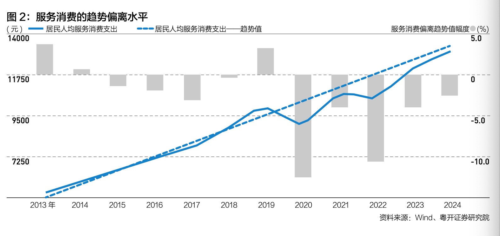 第一,服務(wù)消費(fèi)整體穩(wěn)步增長,但尚未恢復(fù)至2020年之前的趨勢水平。2013年至2024年,我國居民人均服務(wù)性消費(fèi)從0.5萬元提升至1.3萬元,占總消費(fèi)支出的比重從39.7%上升到46.1%。但在2020年居民消費(fèi)受到了較大沖擊后,服務(wù)消費(fèi)尚未恢復(fù)至2020年之前的趨勢水平,恢復(fù)進(jìn)度顯著慢于商品消費(fèi)。據(jù)測算,2020年居民商品消費(fèi)受到的沖擊相對較小,到2021年很快就恢復(fù)到了趨勢水平之上;但服務(wù)消費(fèi)在2020年受到的沖擊更為猛烈,到2024年仍較趨勢值低2.6個百分點(diǎn)。