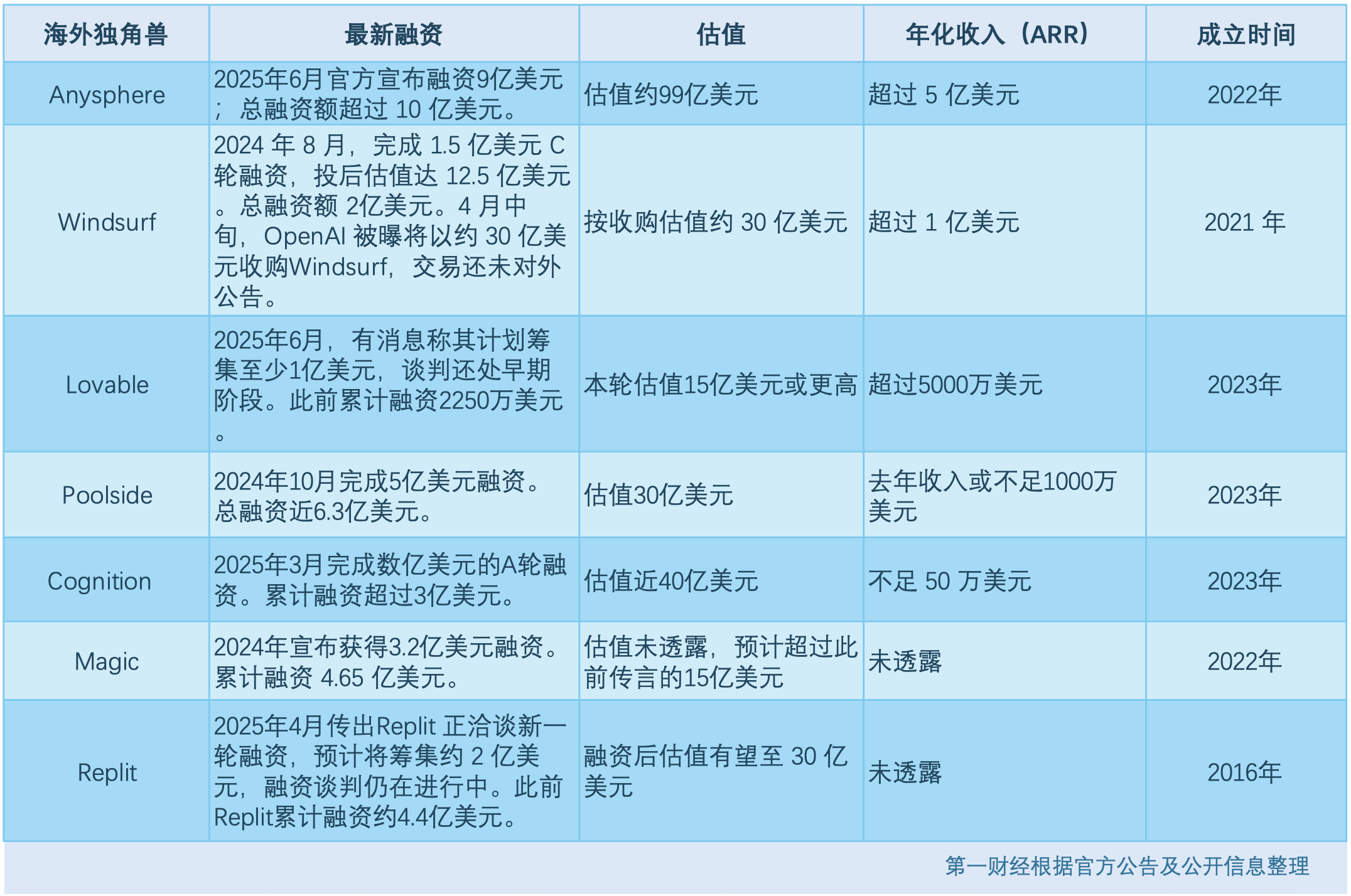 據(jù)第一財(cái)經(jīng)不完全統(tǒng)計(jì),以Anysphere為首,在海外,估值超過10億美元的AI編程獨(dú)角獸至少已有7家,總?cè)谫Y額近34億美元(人民幣超過240億元)。