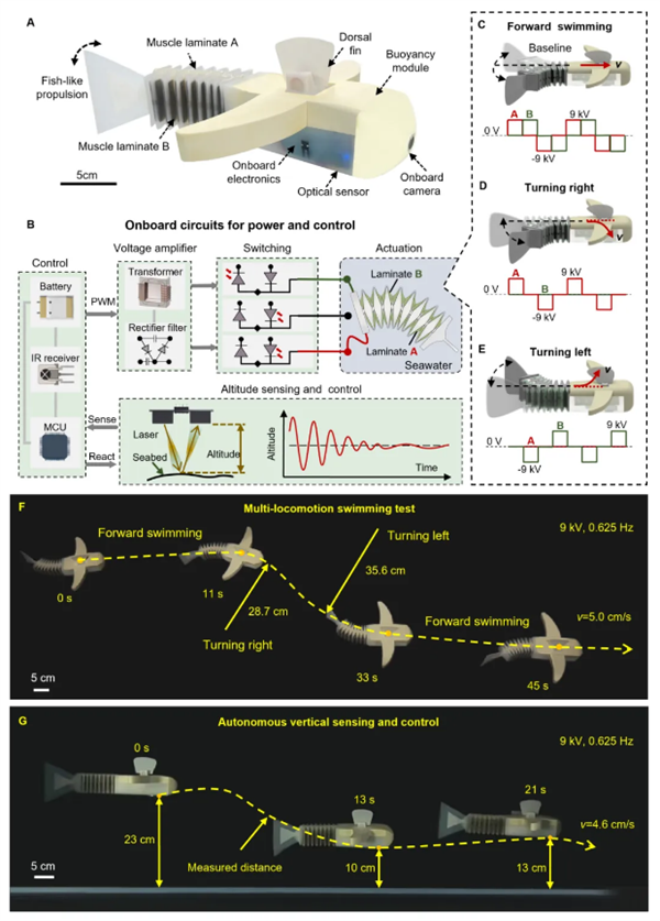機器人通過自帶的小型化能源系統驅動多個柔性電液單元協同工作。當軟基體中的電子器件產生高壓電信號時,電液單元在電壓作用下形成類似“流體靜力骨骼”的變形機制,從而推動機器人在深海中實現直行、轉彎等多種運動。