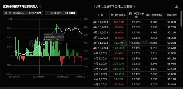 近期比特幣現貨 ETF 凈流出規模巨大,引發市場關注。據SoSoValue數據顯示,4月18日比特幣現貨 ETF 凈流出達到2315萬美元,已連續5日凈流出。截止目前,比特幣現貨ETF總資產凈值為524.1億美元,ETF凈資產比率高達2.82%,歷史累計凈流入更是達到了122.4億美元。